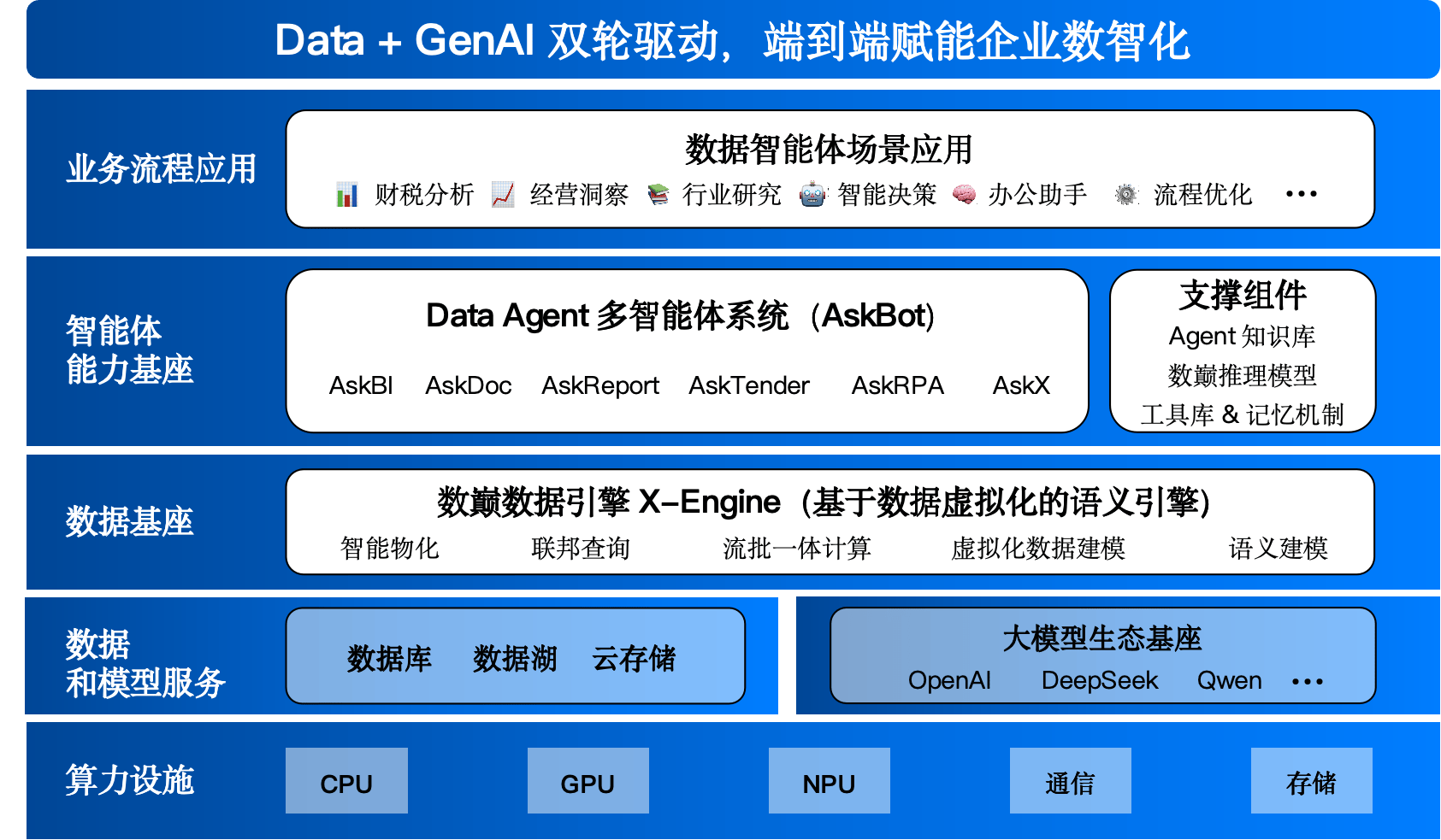 “Data Agent不仅是降低问数门槛的智能体工具,更是未来全场景渗透的企业业务智能体的通用基座,将成为企业业务智能化的核心基础设施。”数巅创始人及CEO何昌华博士表示,“Data Agent通过整合企业内的跨源异构数据,为大语言模型提供面向语义的数据资产以及高性价比数据服务,重塑了企业数据分析范式。这远远超出了模型能力本身,是一个为企业初步实现数据驱动决策,且具备泛化能力的完整AI系统,本质上是为企业打造了一个人人可用的数据分析师助手。随着Data Agent逐步在业务场景落地并迭代成为一个个业务助手,将必然驱动企业业务流程全面智能化。这将是人类有史以来最大的一次生产力跃迁,我们期待和行业伙伴一起打造出一个企业级智能体的‘操作系统’,帮助每家企业构建自己的各类岗位助手并充分协作完成复杂业务,从而驱动企业架构向智能体化升级,进入真正的Agentic AI时代。”
